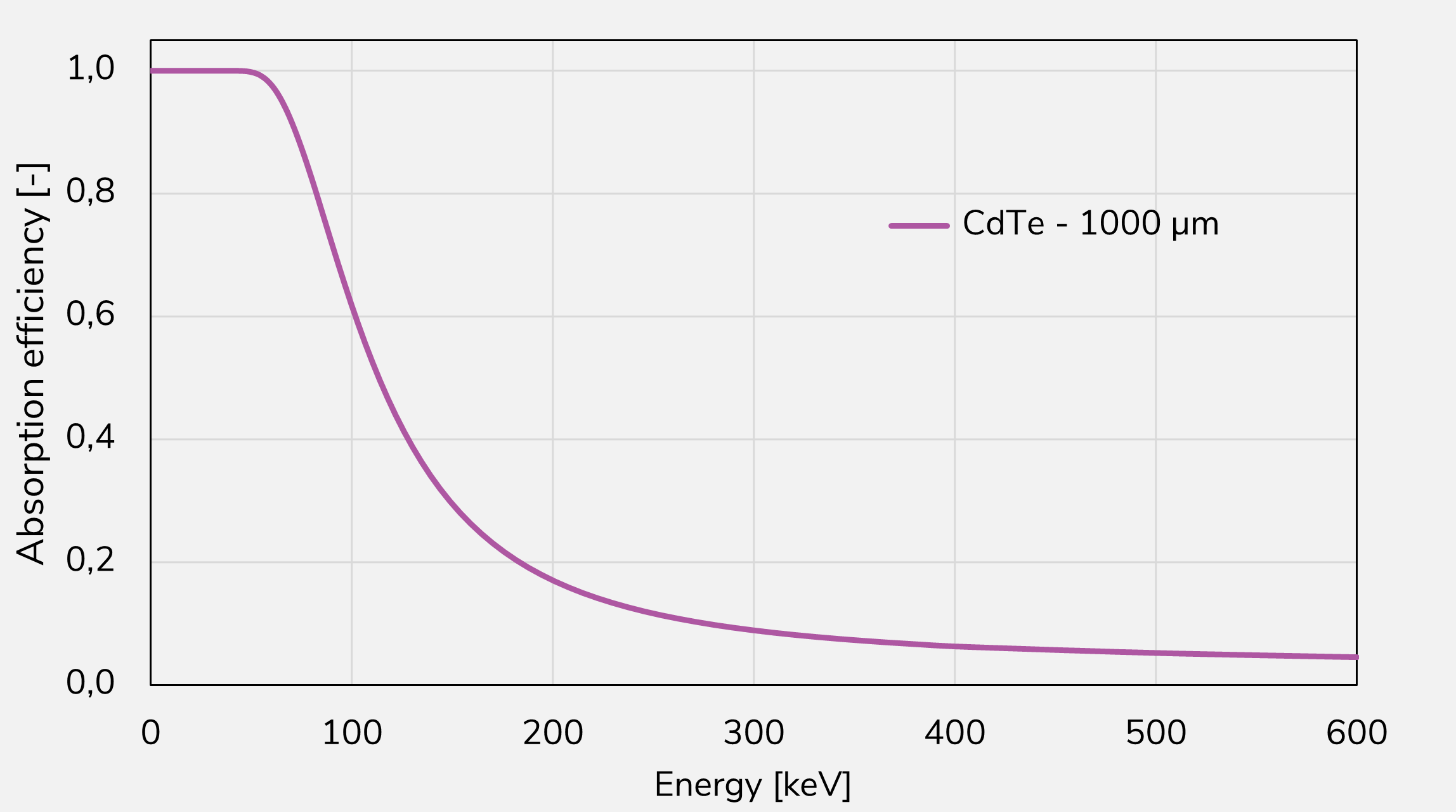 Detection efficiency for photons: Nearly 100 % up to about 80 keV, remaining above 50 % around 120 keV, and gradually decreasing beyond 150 keV; still responsive at several hundred keV.
