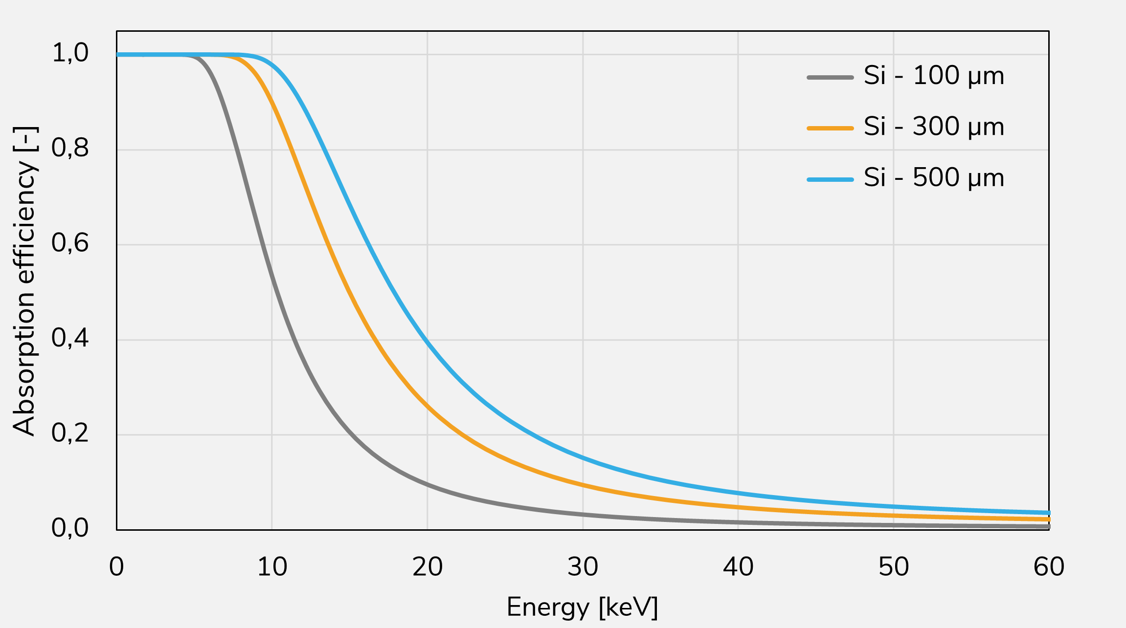 Detection efficiency for photons: Close to 100 % below 10 keV, around 50 % near 17 keV, and below 10 % beyond 40–50 keV.